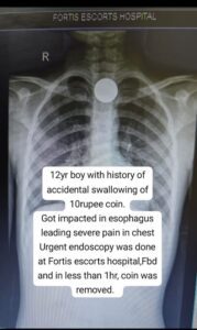 A 12‑year‑old child was rushed to the emergency department at Fortis Escorts Faridabad after accidentally swallowing a ₹ 10 coin. The coin, measuring nearly 27 mms in diameter, was lodged in the upper esophagus and was causing intense chest pain and difficulty swallowing. An X‑ray confirmed its presence in the food pipe. Led by Dr. Nirdesh Chauhan, Consultant – Gastroenterologist, Fortis Escorts Faridabad, the medical team opted for an urgent endoscopy to prevent life-threatening complications that could arise from delays, such as esophageal tears, infection, or breathing difficulties. Using specialized endoscopic tools, the medical team successfully removed the coin within an hour of the child’s arrival. The extraction itself took about 15 minutes, after which the child was discharged safely later that evening. Follow‑up inspection confirmed there was no damage caused to the esophagus.